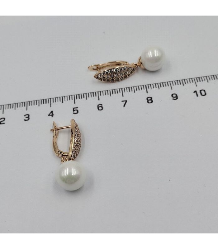 Сережки-підвіски з перлами і цирконами, лимонна позолота