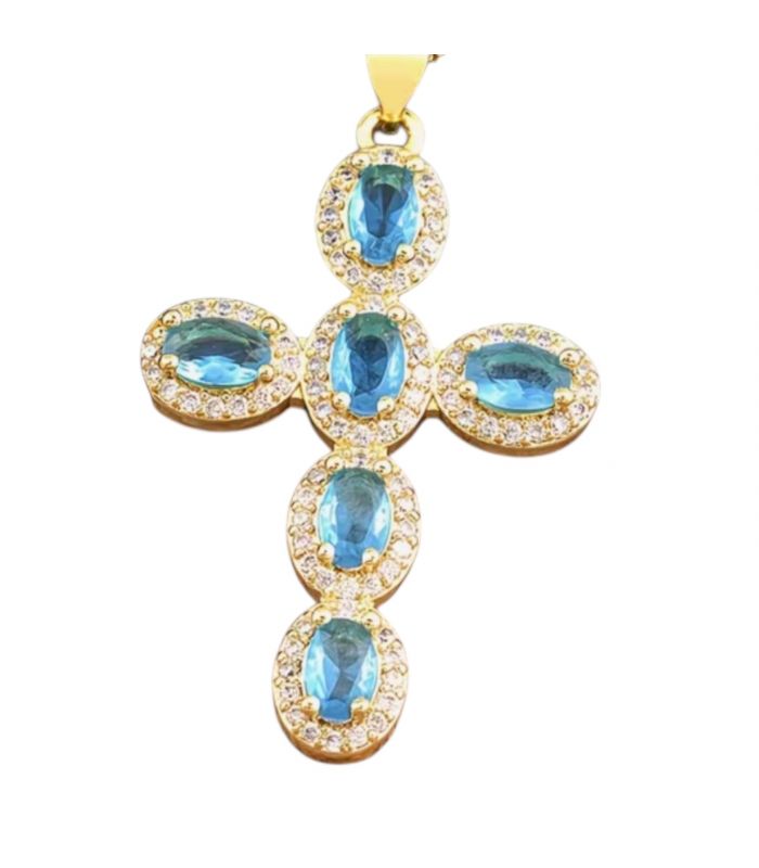Кулон Крестик с голубыми цирконами лимонная позолота