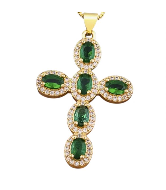 Кулон Крестик с зелеными цирконами лимонная позолота
