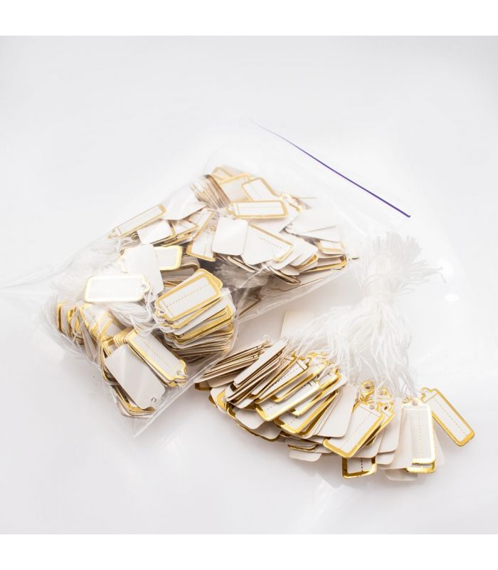 Ценники в наборе 500 шт, изготовлены из картона. Ободок золотистого цвета.