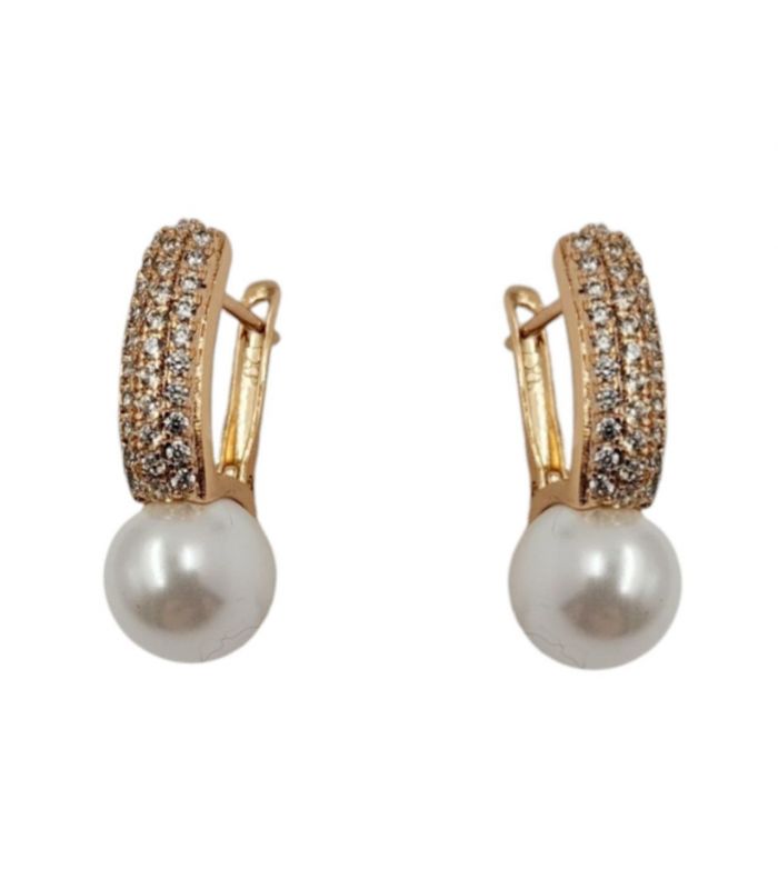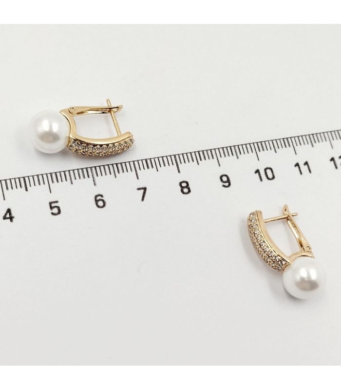 Серьги классические с россыпью цирконов и жемчужиной, лимонная позолота